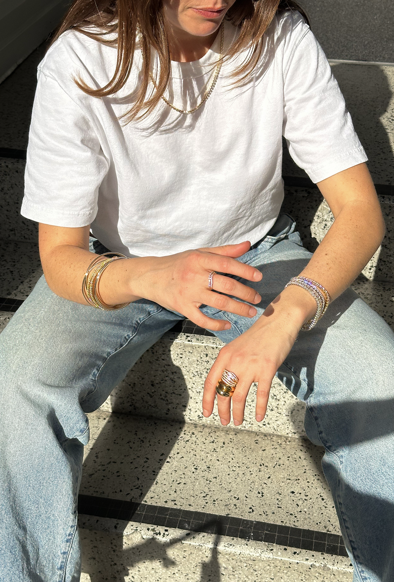 "These stacking rings are a modern take on the trend and feel very chic. The stones add a premium twist."