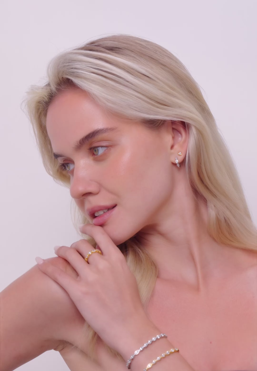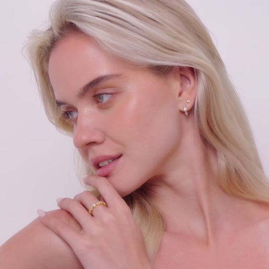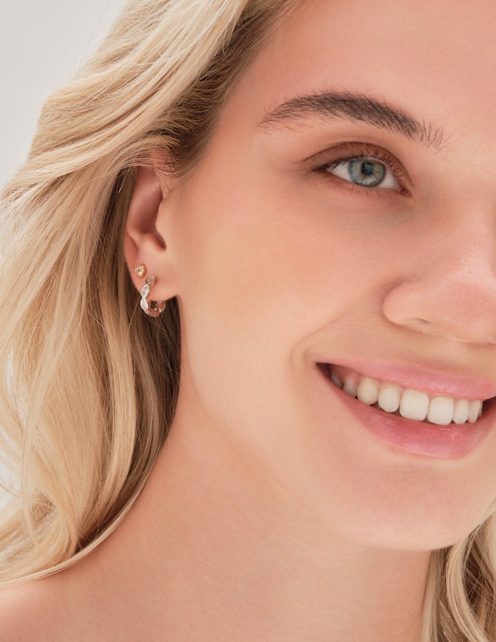 Your daily Ear Stack rotation just got better. Triple up your stack instantly with these Triple Navette Huggies. An everyday style featuring three navette-shaped crystals, these earrings are designed using Sterling Silver and Rhodium plating for added durability and shine.