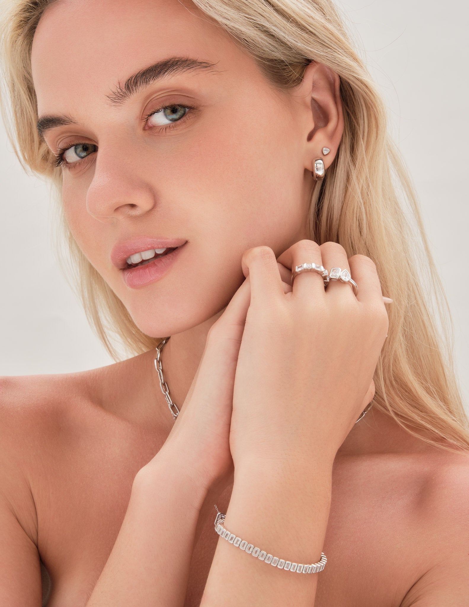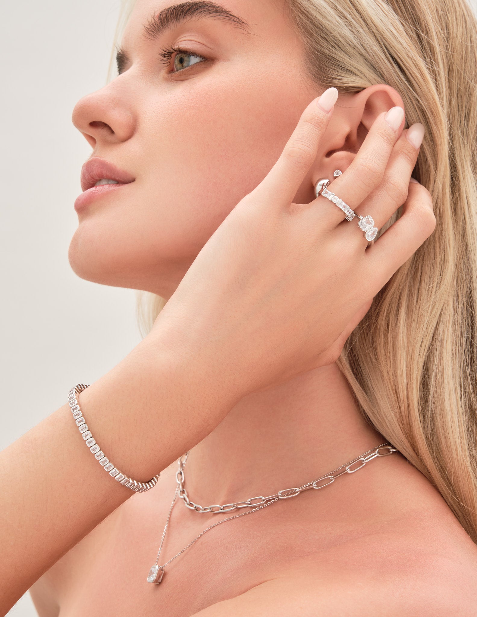 Curate the collection you've always wanted. Pair our Rectangular Crystal Tennis Bracelet in Silver with chunky chains for instant contrast. Featuring Cubic Zirconia all the way around and a clasp you can easily fasten yourself. Designed using Rhodium plating for added strength and shine.