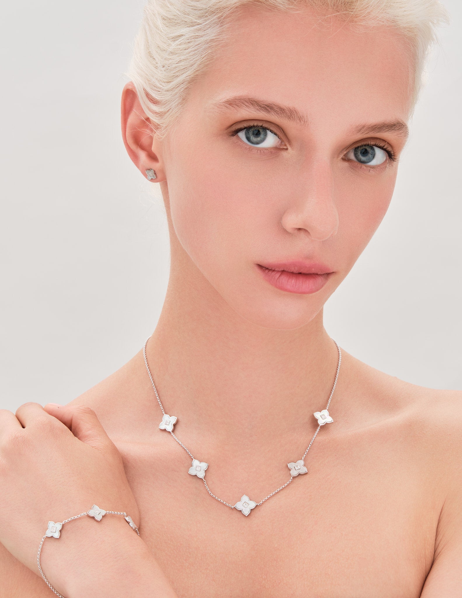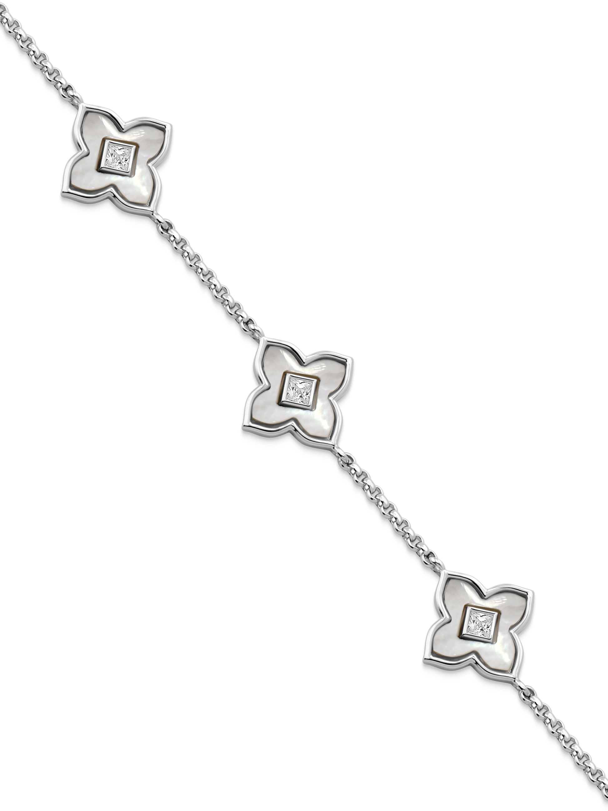 You don't need luck; you need Jewells. This Primrose Mother-of-Pearl Clover Bracelet features primrose detailing to bring good energy to your day, designed from Sterling Silver with a durable Rhodium plating. Wear with the matching primrose mother-of-pearl clover necklace, or wear solo.
