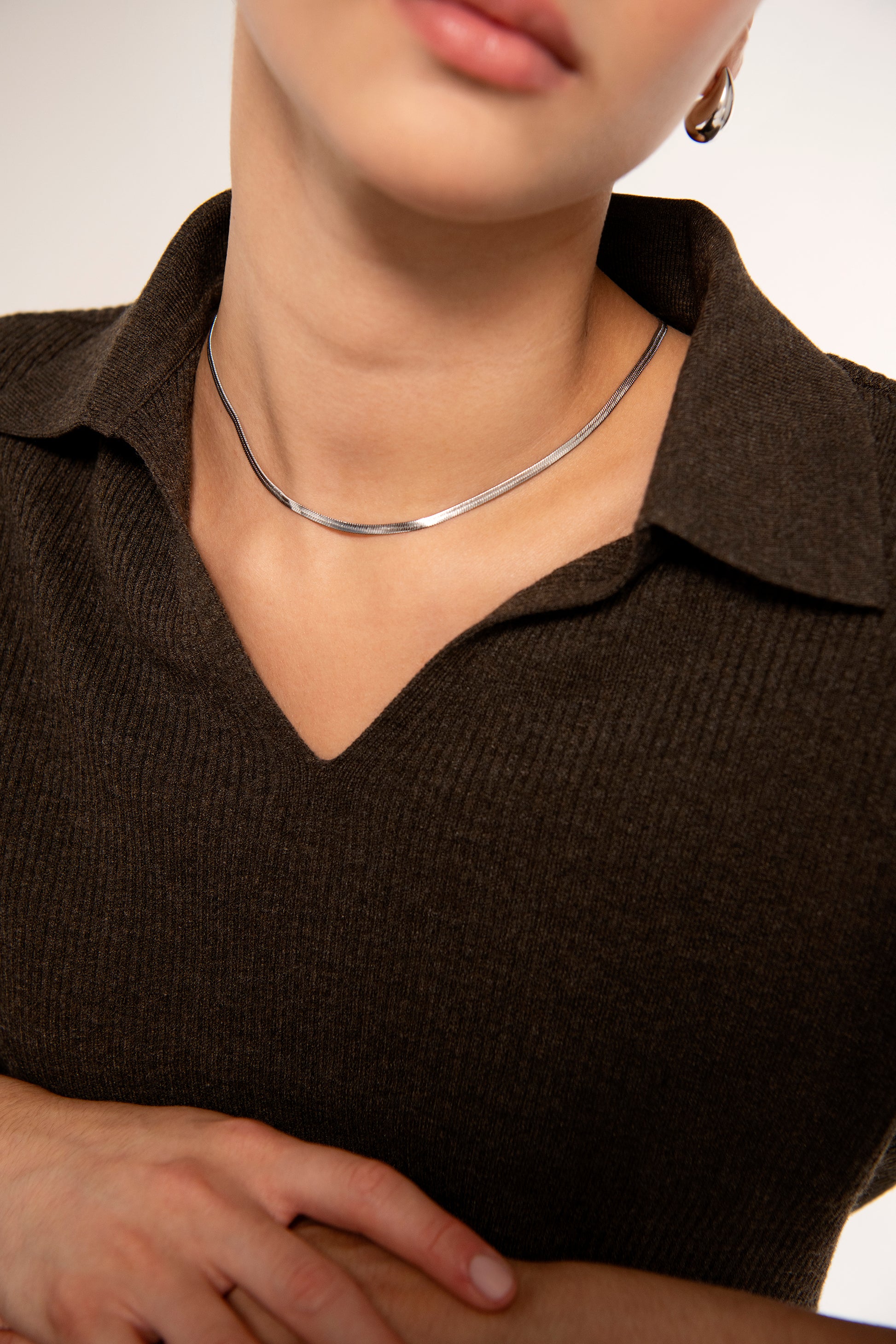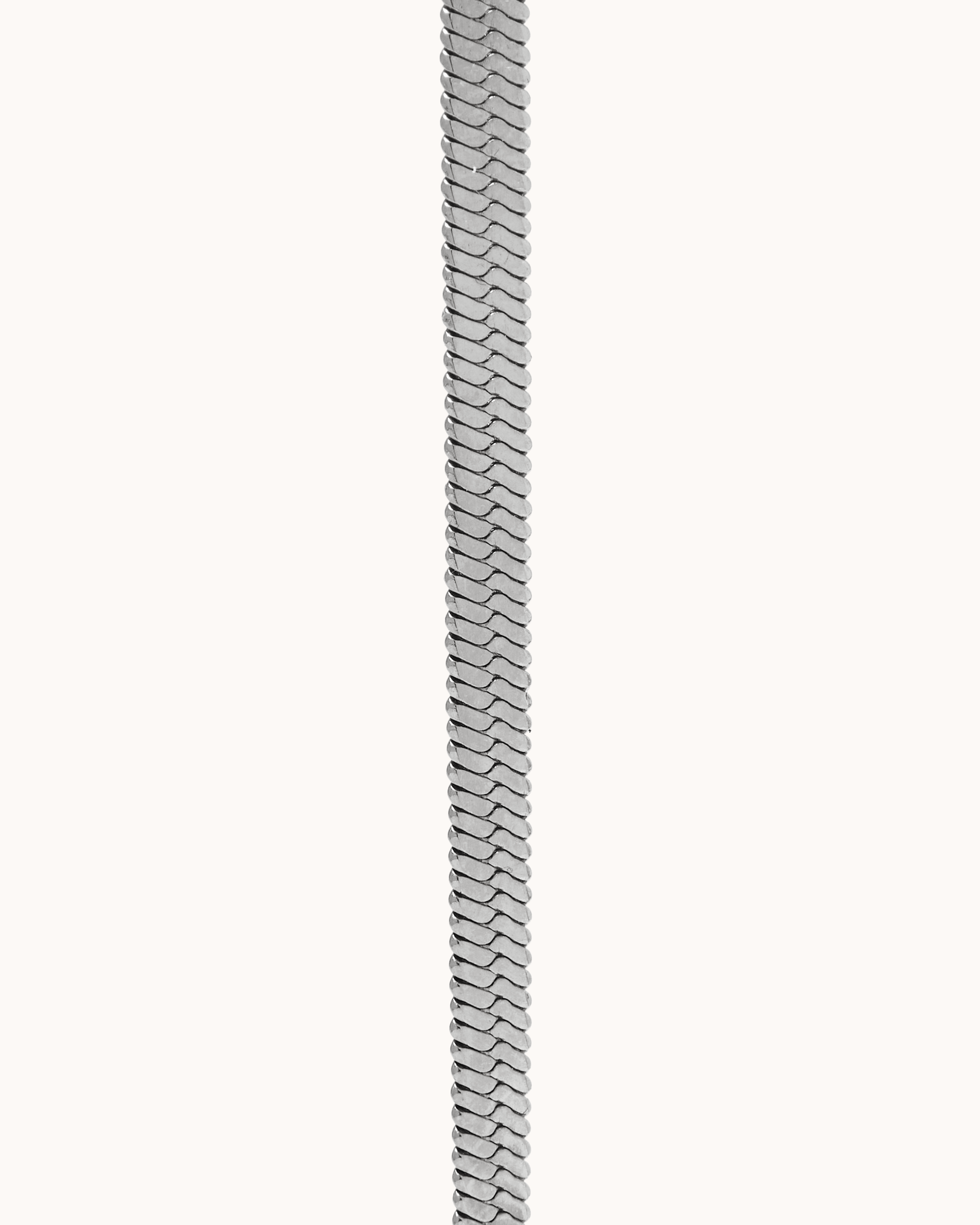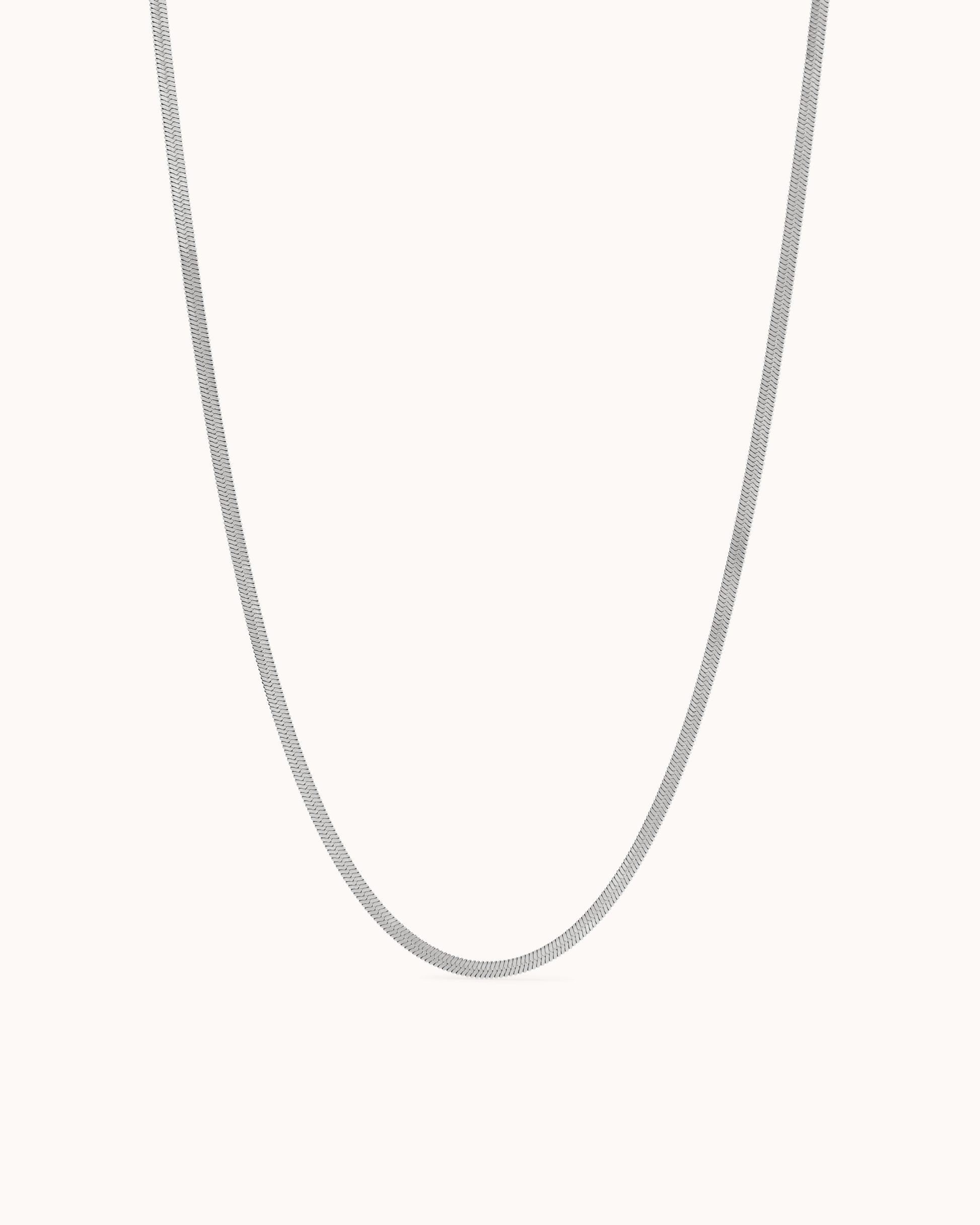A waterproof chain you can style up or down. A classic style for any necklace stack, this Snake Chain Necklace in Silver catches the light from every angle. Made from rhodium-plated stainless steel and PVD coated to give it a waterproof, tarnish-resistant finish.