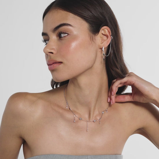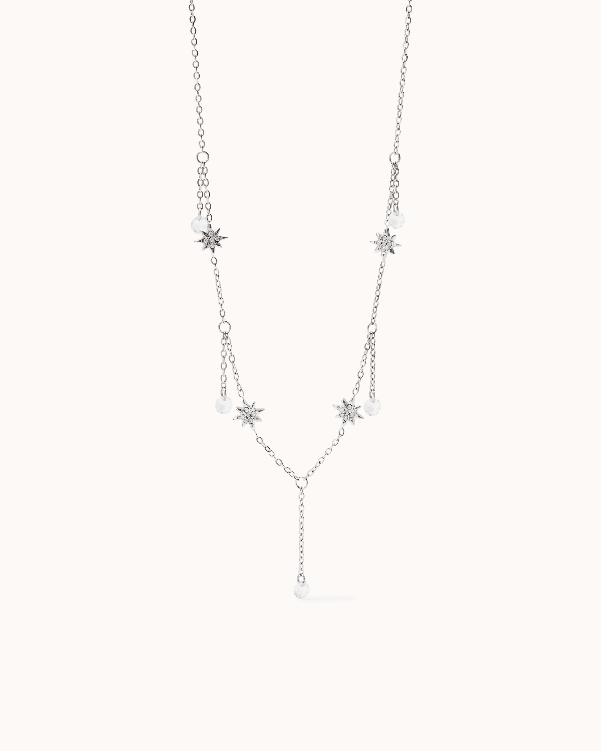 The celestial-inspired necklace you didn't know you needed. This Star & Crystal Drop Necklace features drop-chain moments that add the right amount of sparkle to your layering game. Rhodium-plated, it's finished with a PVD coating to keep it waterproof and highly resistant to tarnishing.