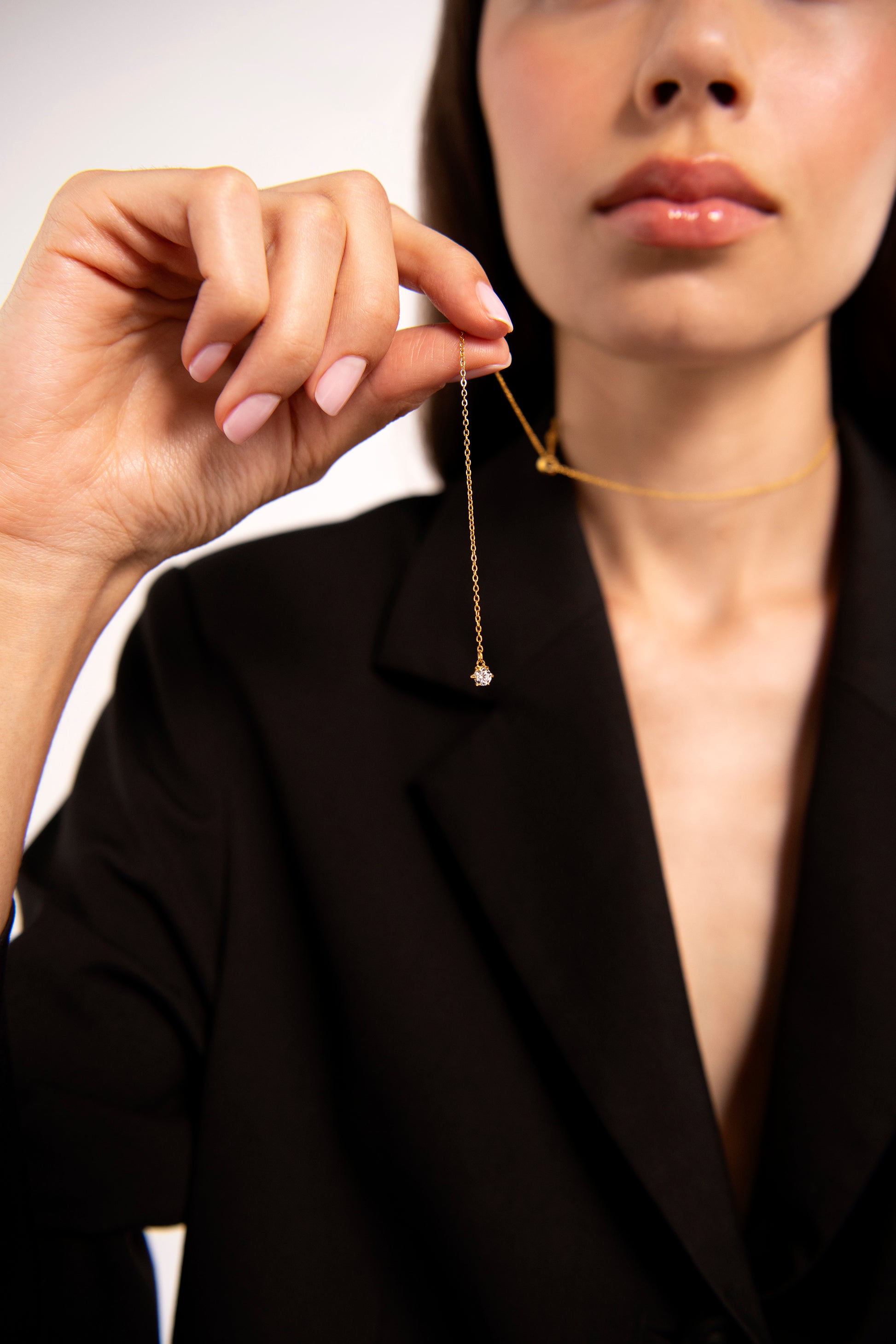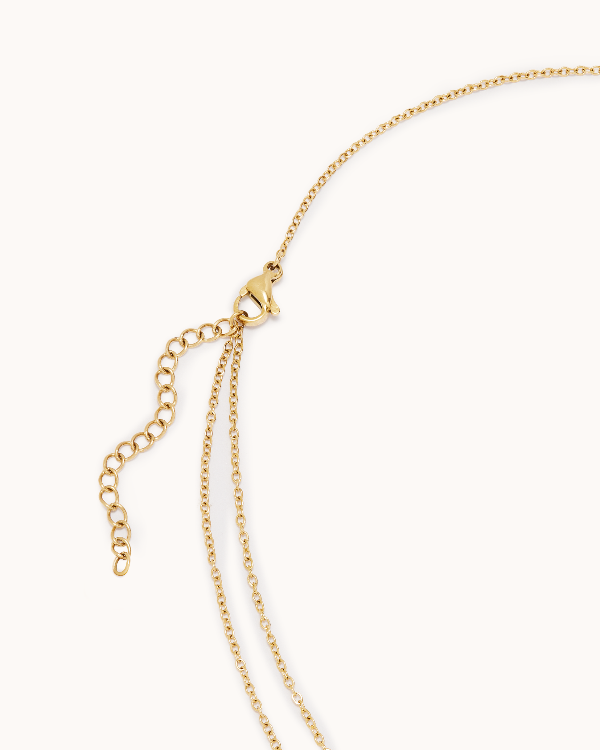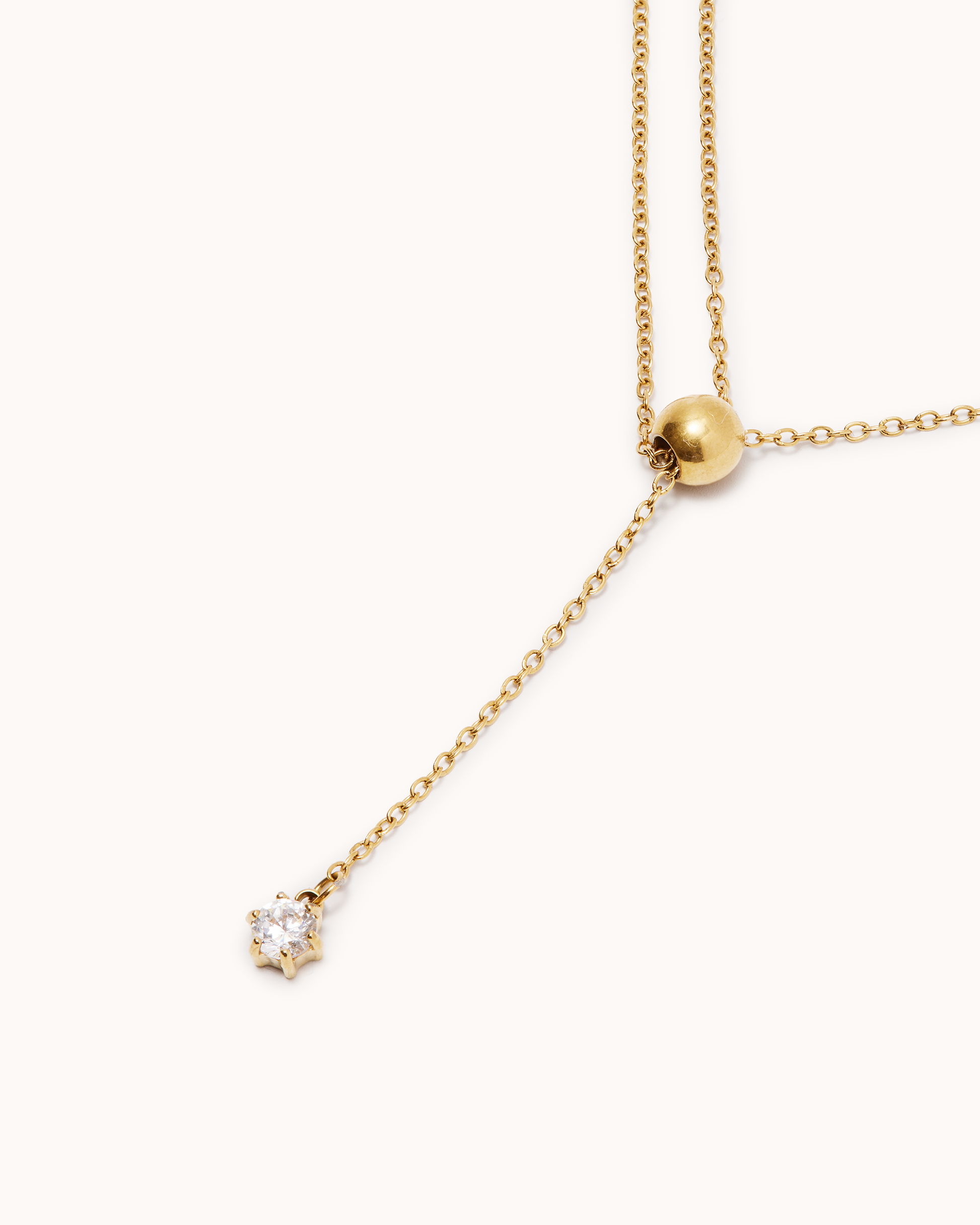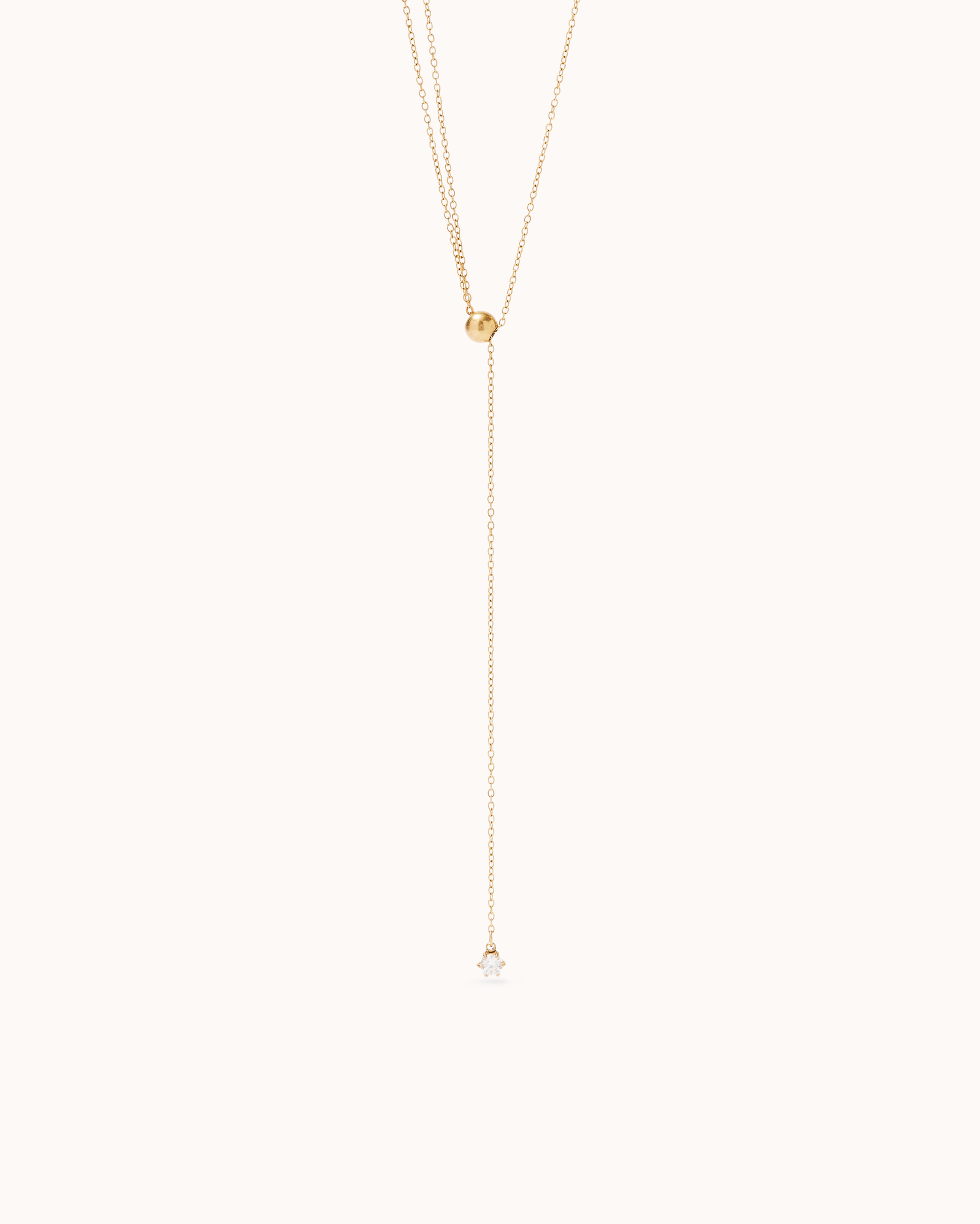 A lariat necklace, not like any other. Our Double Adjustable Lariat Necklace features a doubled-up chain on one side, finished with a cubic zirconia crystal in a lariat style you can move to suit any neckline. Made using stainless steel with 18K gold plating, this is PVD coated for a waterproof, tarnish-resistant finish.