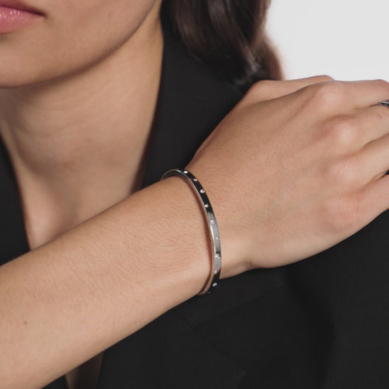 The bangle to build your arm stack with. This celestial-inspired Crystal Bangle in Silver is set with tiny cubic zirconia stars with an easy on-off hinge closure. Finished with rhodium plating and PVD coating, which keeps it tarnish-resistant for longer — shower, swim, sweat, live in it.
