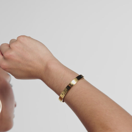 The everyday bangle that's waterproof too. Our Classic Flat Bangle is a chunky, versatile bracelet that serves as the starting point for your stack. Easily adjusts on and off. Finished with a PVD coating to keep it highly tarnish-resistant, and plated with 18K gold.