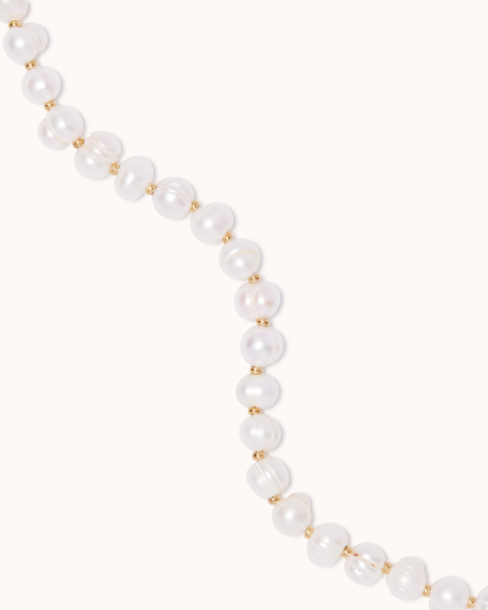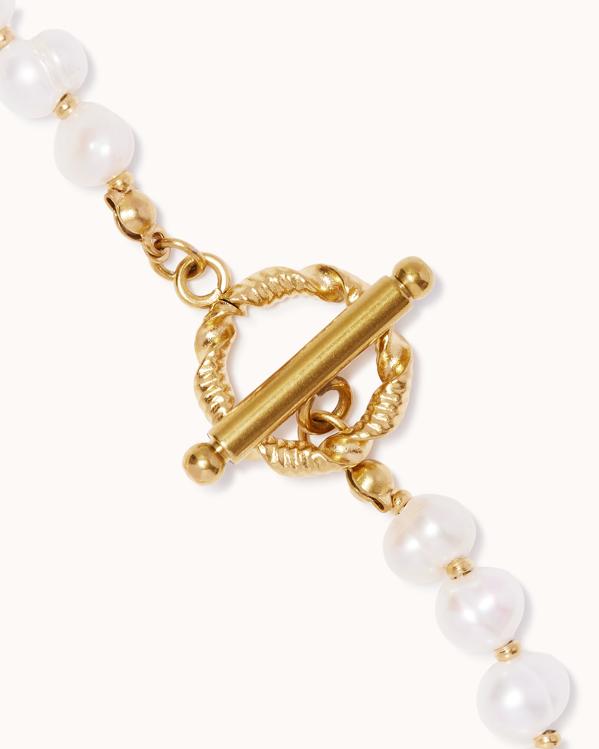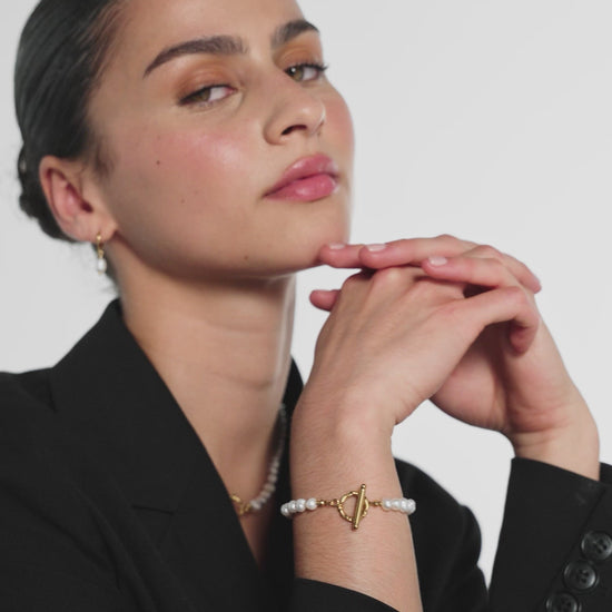 A future-proof take on a timeless bracelet stack staple. This waterproof T-Bar Pearl Bracelet in Gold combines classic pearls with hammered gold T-bar detailing, which is easy to adjust on and off. Plated with 18K gold, its PVD coating gives it a waterproof, highly tarnish-resistant finish.