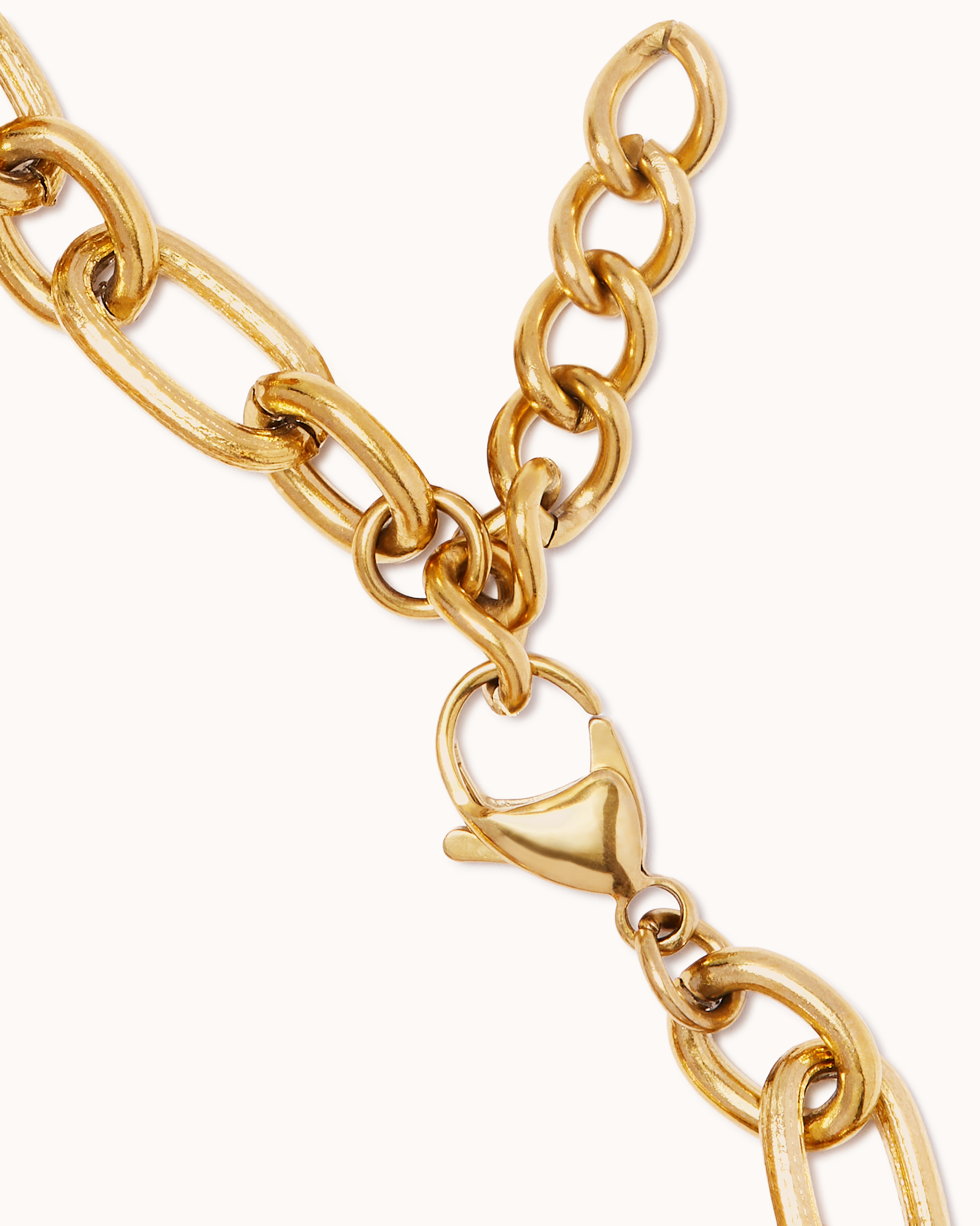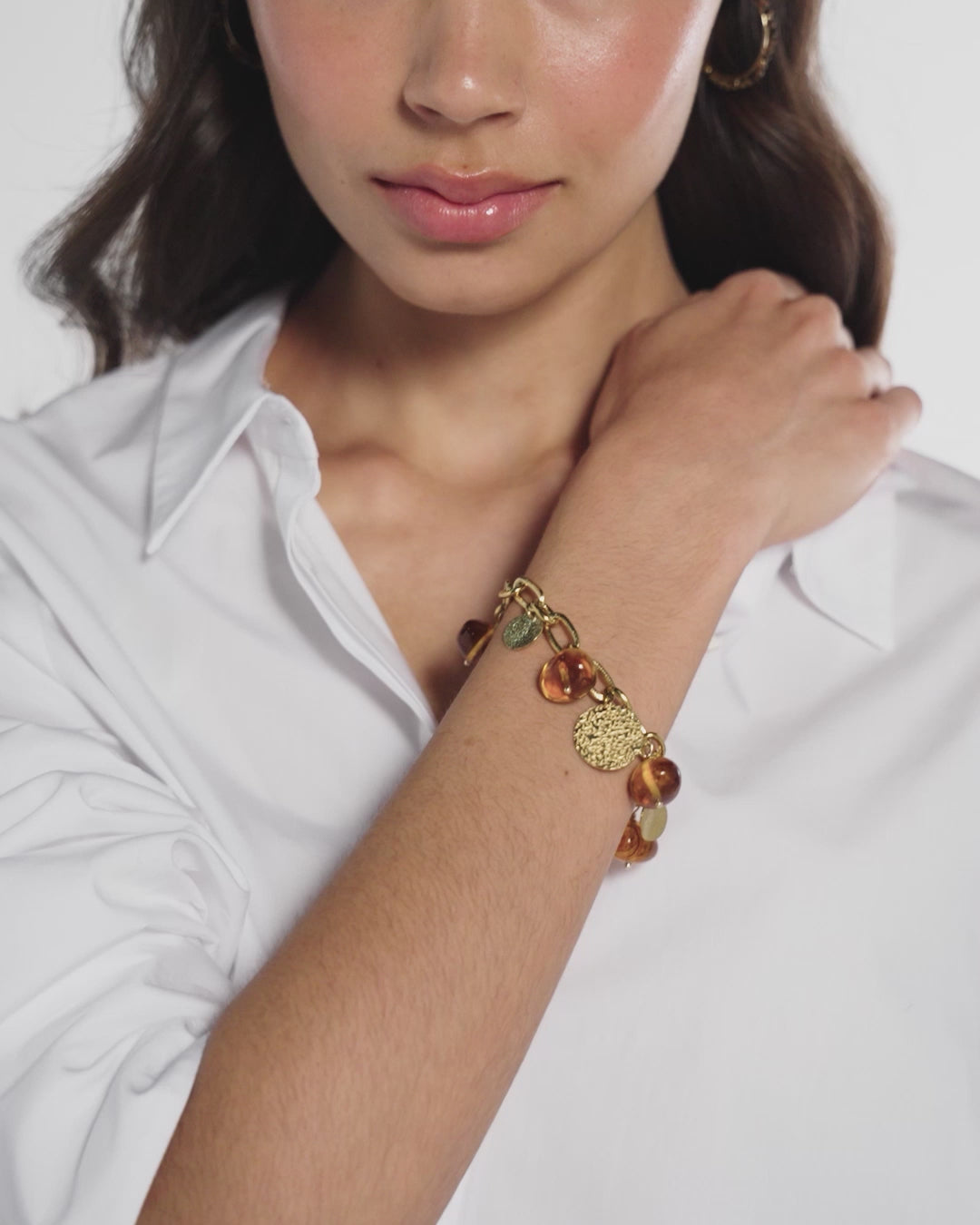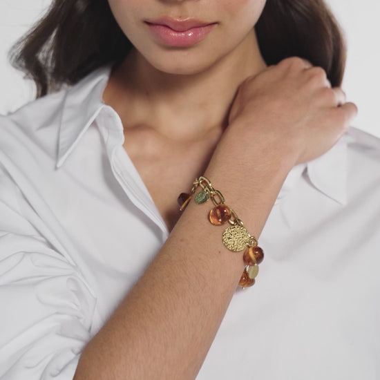 The chunky companion to your delicate bracelets. Our Chunky Charm Bracelet in Brown is an oversized, statement chain style with brown-toned glass charms and a hammered metal disc. Team with sleeker chains for contrast. Made using 18K gold-plated stainless steel and PVD coated for a waterproof design.