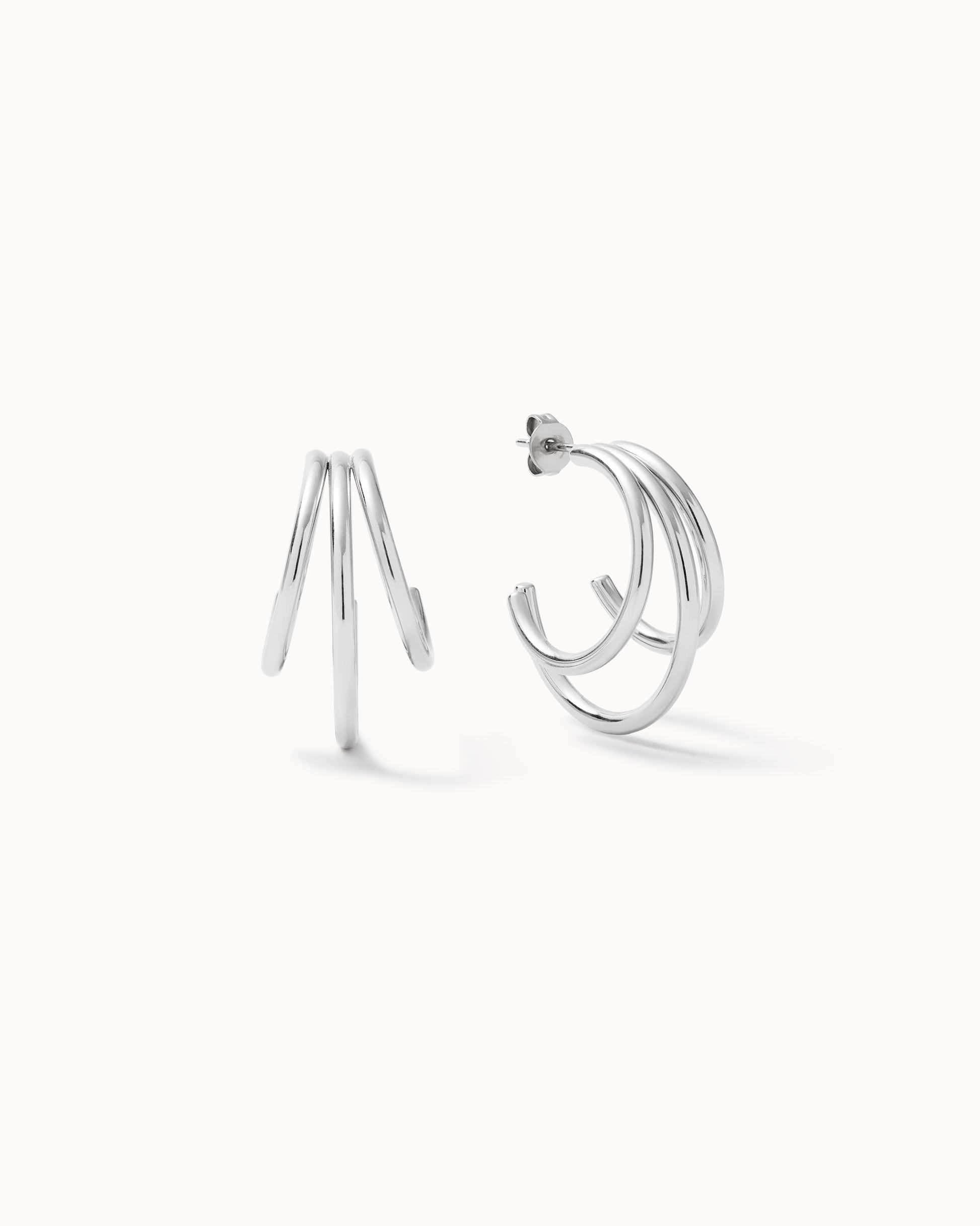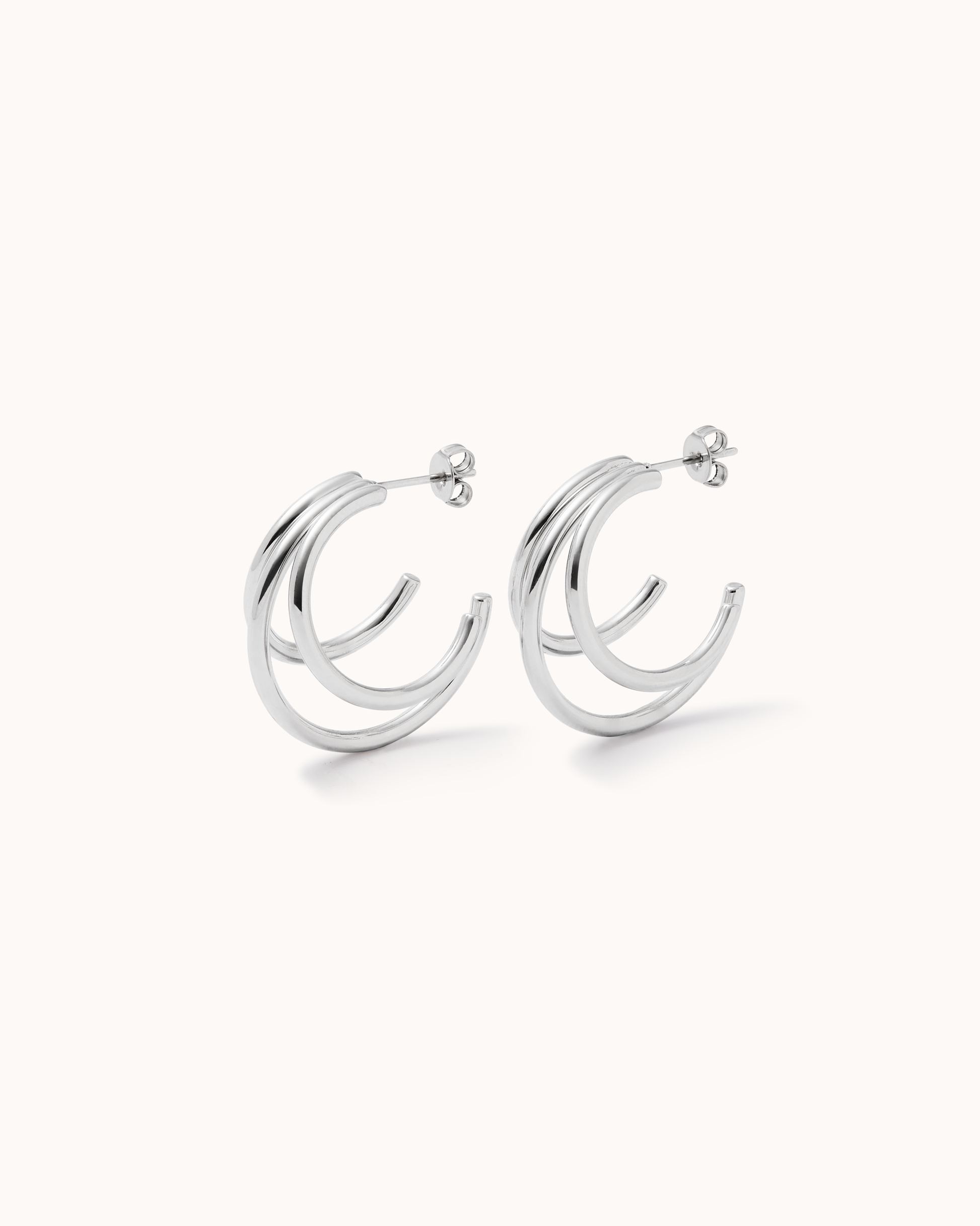 Two hoops in one. Our Slim Double Hoops are designed with two rows of hoops for a doubled-up effect. Wear solo or stack alongside chubby huggies for contrast. Made from rhodium-plated stainless steel, PVD-coated to give it a waterproof, tarnish-resistant finish.