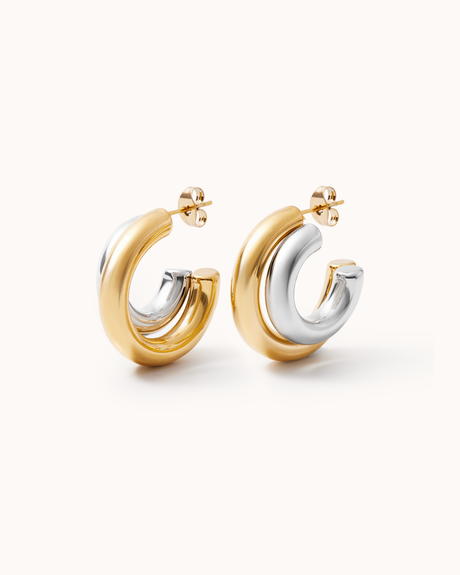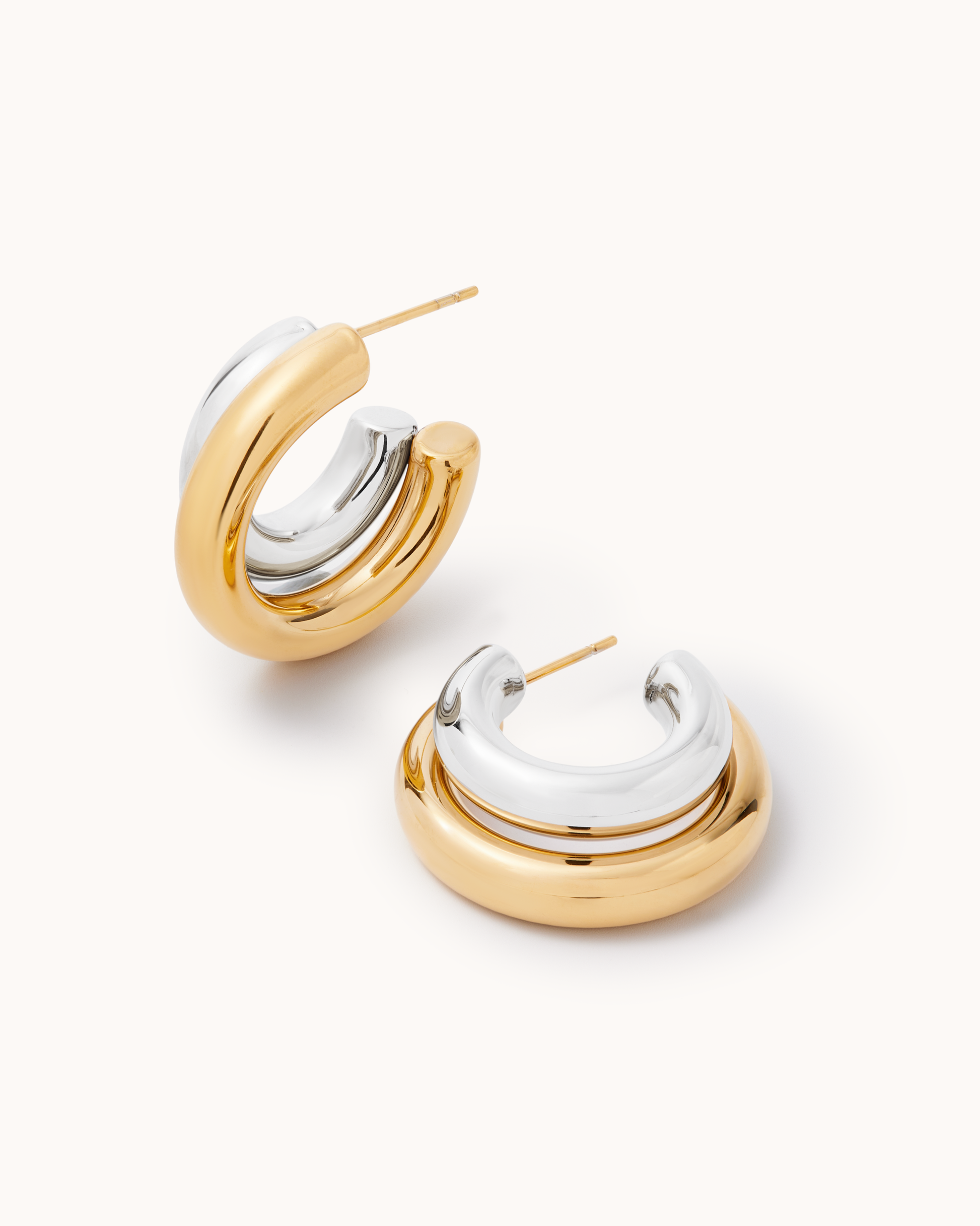 Your new everyday hoops, but waterproof. Our Chunky Double Hoops give you two looks in one with a mixed gold and silver metal effect. Stack alongside classic stud earrings or wear solo. Made from both 18K gold and rhodium-plated stainless steel, PVD-coated to give it a waterproof, tarnish-resistant finish.
