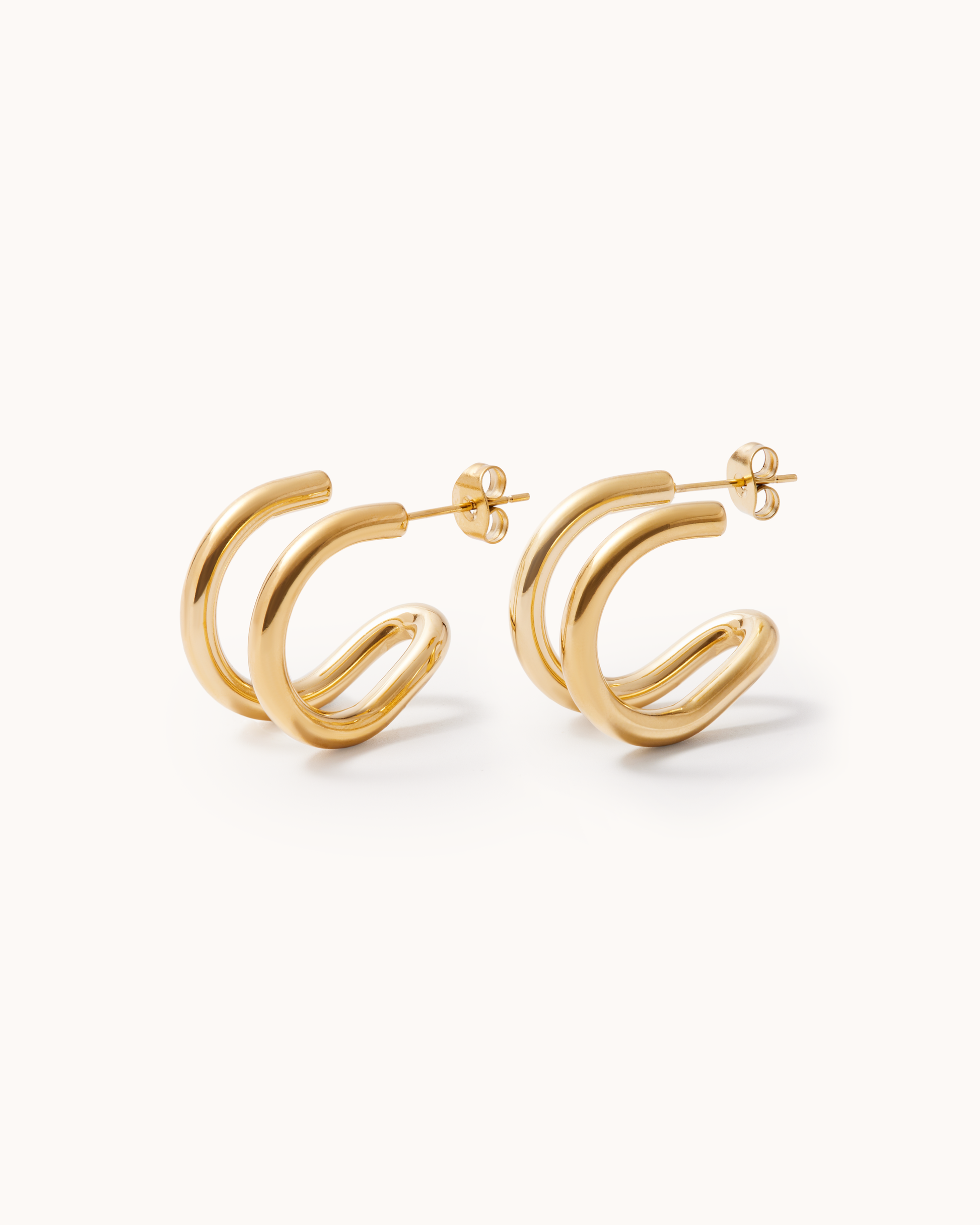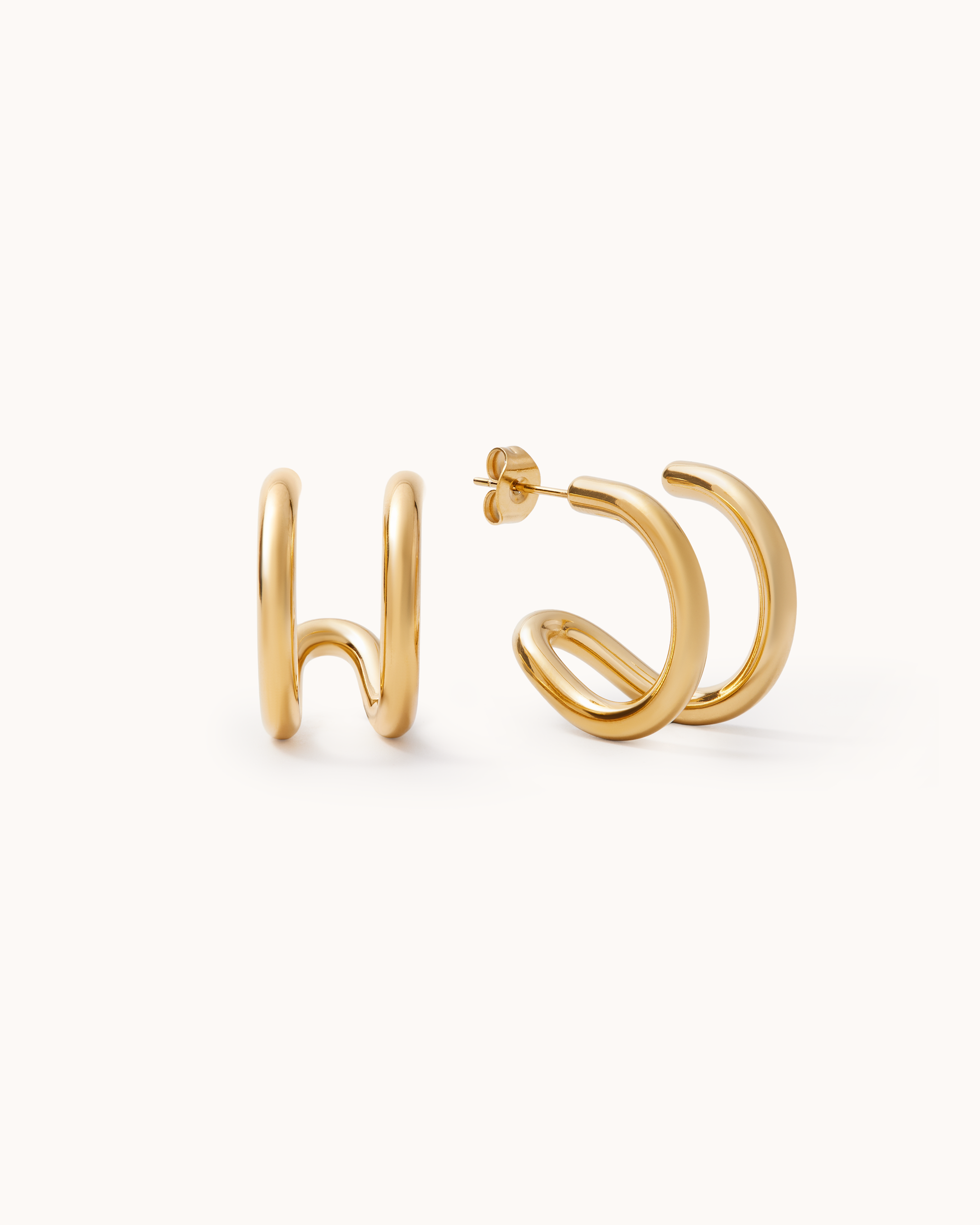 Earrings to complete your look with. Our Cuff Studs give the illusion of ear cuffs for studs that feel more like hoops. Made from 18K gold-plated stainless steel, PVD-coated to give it a waterproof, tarnish-resistant finish.