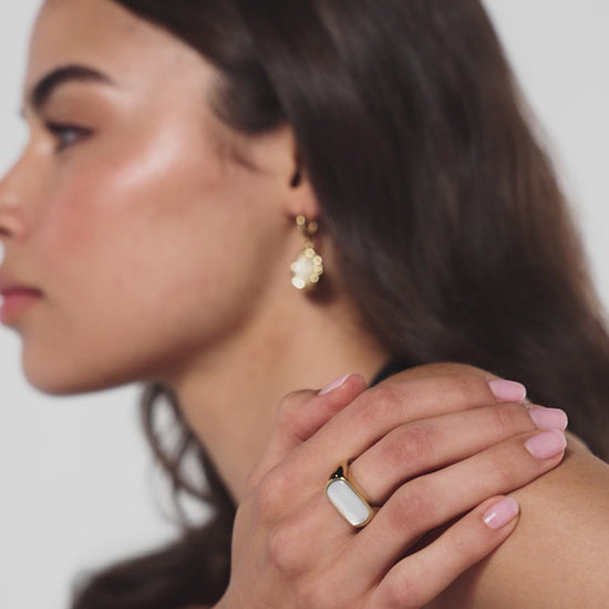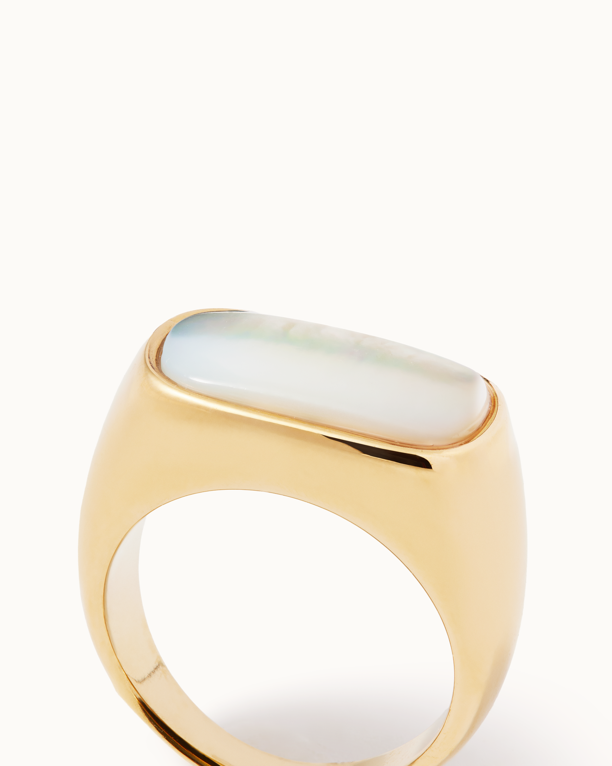 Chunky, cool and 100% waterproof too. Our Chunky Moonstone Ring is a signet-style design set with semi-precious clear moonstone. Plated with 18K gold for a shiny, golden finish and PVD coating that resists tarnish.
