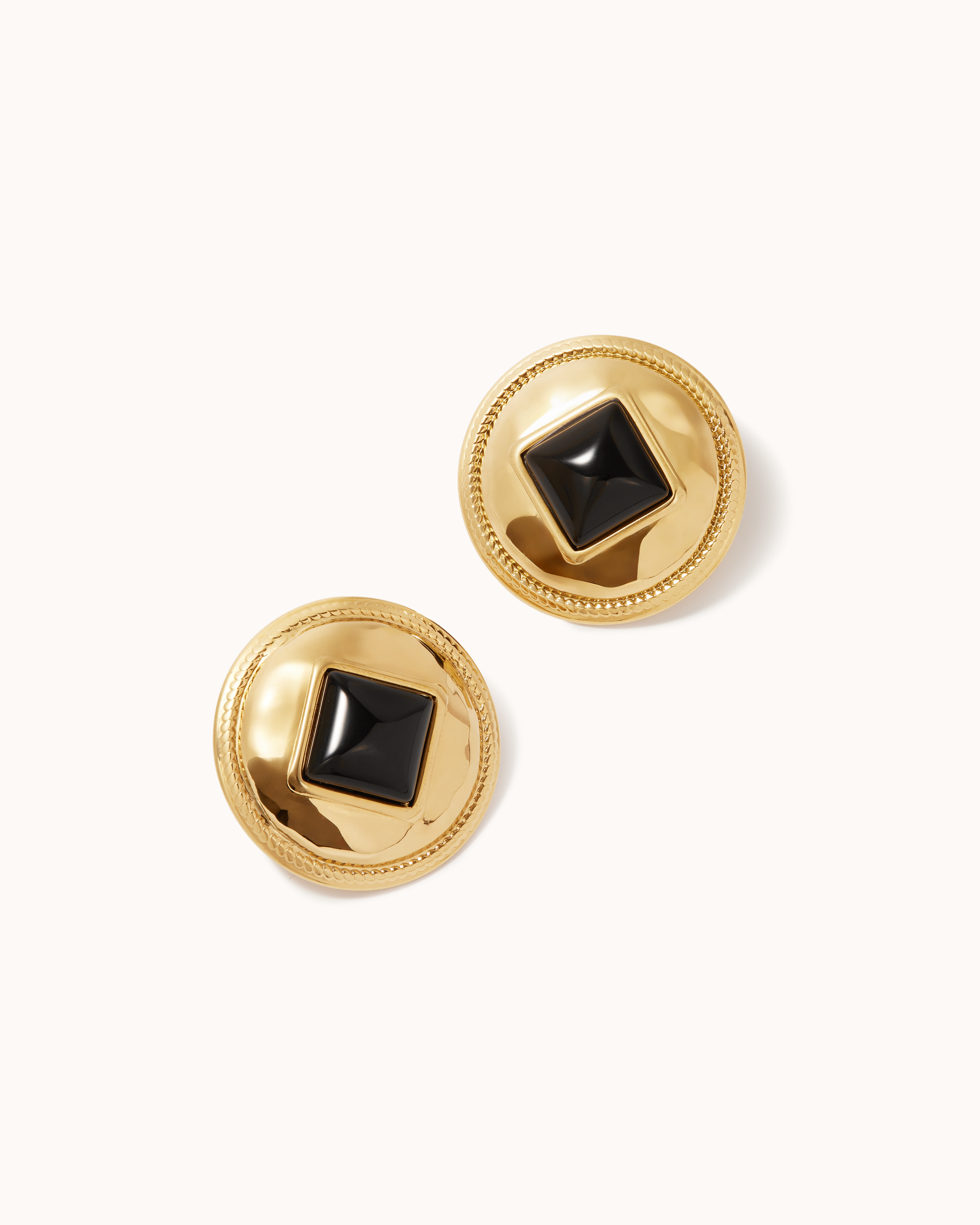 The Black Enamel Square Studs combine bold braided framing with a central black enamel diamond-shaped bead.