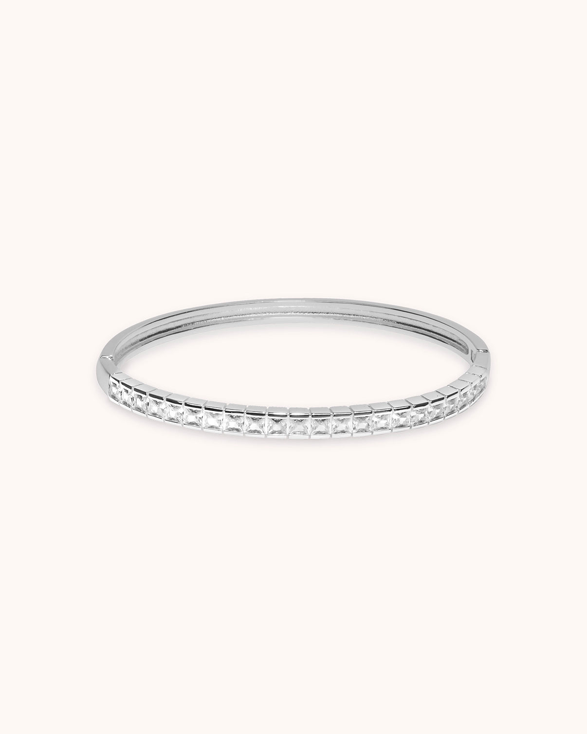 Meet the silver tennis bangle with cubic zirconia crystals for instant, stack-ready shine.
